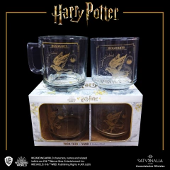 Pack de taza y vaso de vidrio con escudo en dorado de Hufflepuff de la línea Celestial Gold, de Harry Potter!
